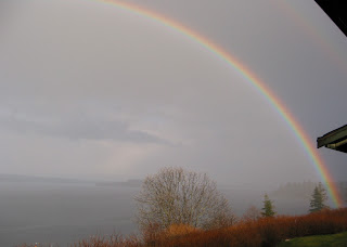 Again, the weather out there is amazing. It's quite stormy but the sun is breaking through and there is almost a rainbow now. When I looked out the window, the thing that really got my attention was the quality of the light out there. Right here almost at my feet was the bright emerald green of the grass that is thriving in our early 'spring'. Above the grass the red tinged branches of the bare and leafless canes of the wild blackberry bushes. The sun coming from behind me, over the rooftops is just barely beginning to light the canes. Another step upward toward the skyline and there is the frothing foam of the whitecaps as the wind pushes the waves into the shoreline. The sea is reflecting the deep grey of the passing clouds. The lowest of the clouds are shaded darker because you can almost see the mountains in the distance through them. From there, the sky shades through a grey scale with light spots and darker spots and some that are almost pure white. The sky is bright and ever changing.